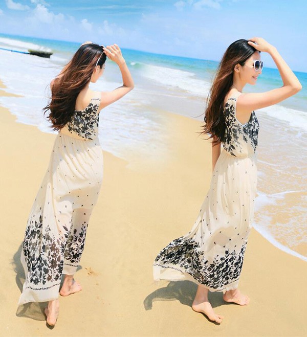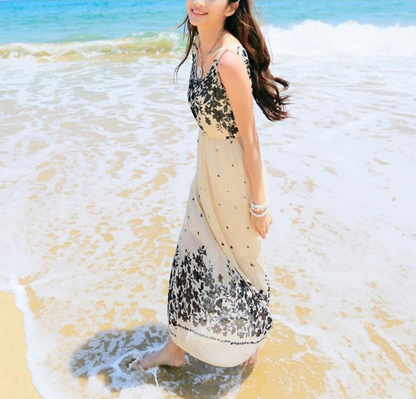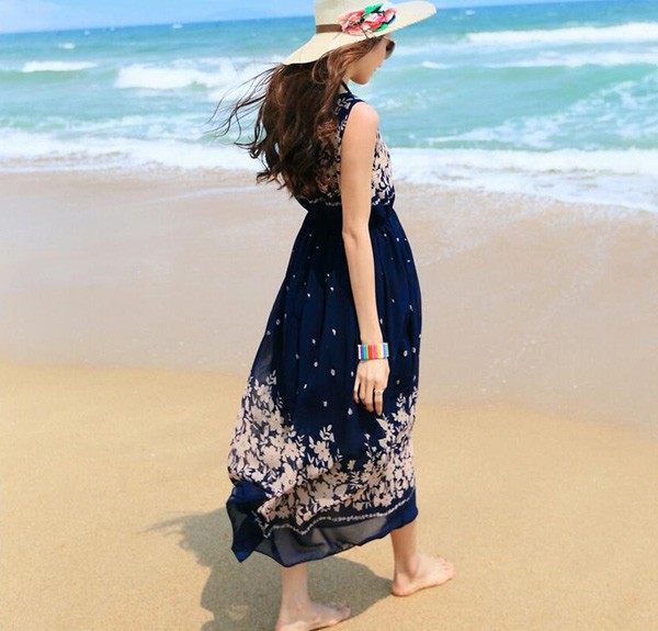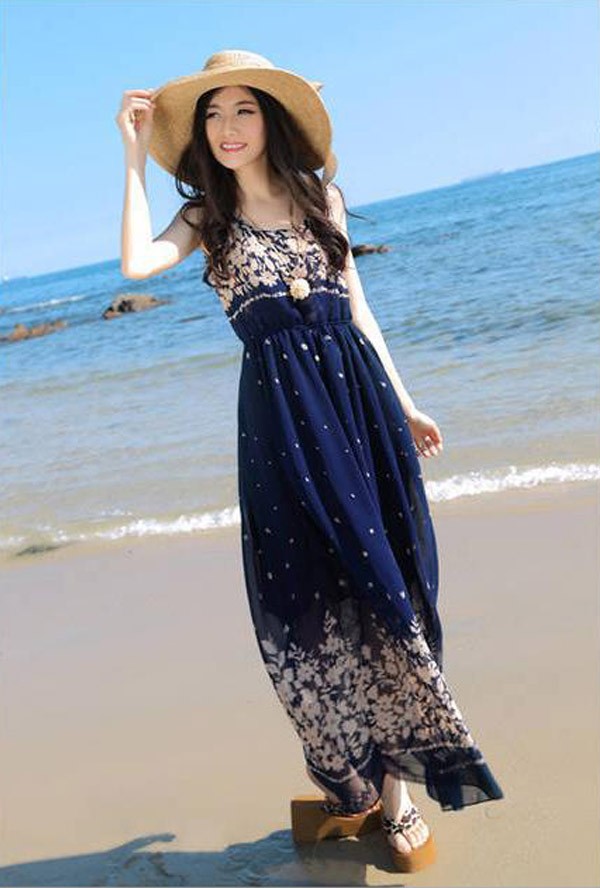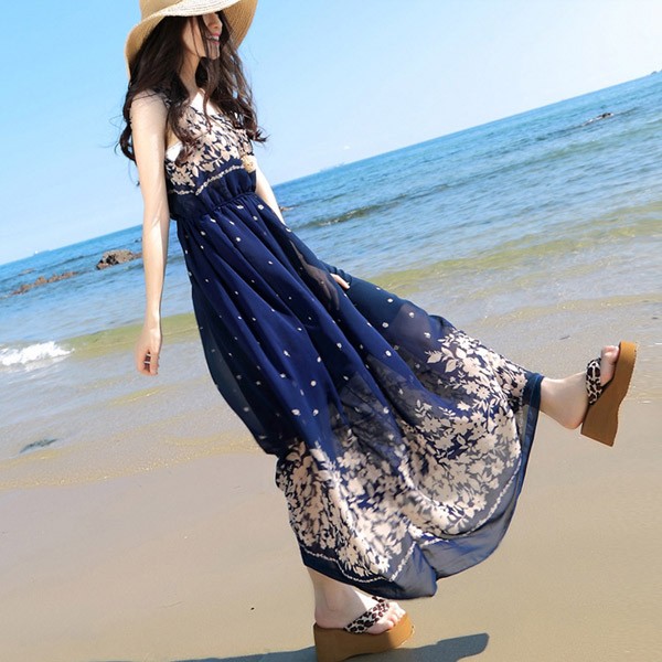 ワンピース 袖なし 花柄 夏ワンピ 可愛い ゆったり ロング丈 ラウンドネック 着痩せ 上品 セクシー 夏ワンピース 夏 リゾートワンピ 旅行 海 海辺 バカンス デート お出かけ ライトベージュ ブルー フリーサイズ