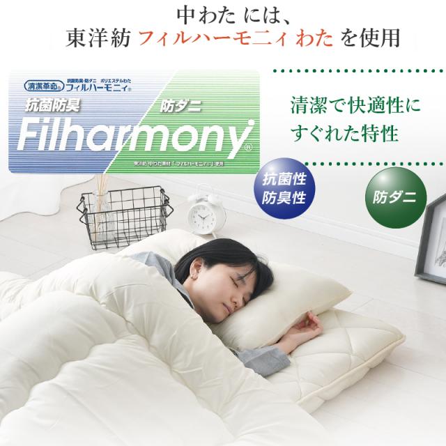 『フィルハーモニーは、東洋紡の練り込み技術と加工技術の応用により、ポリアーに抗菌防臭・防ダニ機能のある成分をブレドしたポリエステルわたです。』