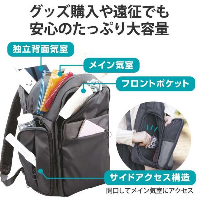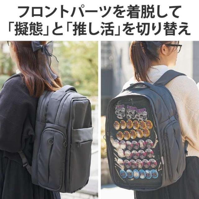 ■あなただけの推し活を応援する、推しごとバックパックです。 ■日常のお出かけの際にも街に溶け込み、会場付近までの移動中にも活躍する「擬態モード」と、ぬいぐるみやバッジをアピールできる「推し活モード」を切り替えられます。 ■普段は隠せる大きな透明窓で、大好きな推しをバッチリアピールできます。 ■イベント時のグッズ購入はもちろん、ちょっとした遠征でも安心の、たっぷり大容量です。 ■面ファスナーでしっかり固定できる、着脱式のディスプレイ用仕切りが付属しています。 ■ディスプレイ用仕切りには、ストラップや缶バッジを取り付けやすい粗目のメッシュ生地を採用しています。 ■ディスプレイ用仕切りを折りたたんで固定することで、簡易2気室構造にすることができ、ぬいぐるみなど厚みのあるグッズの配置にも対応します。 ■ディスプレイ用仕切りを取り外すことで、メイン気室の空間全体を見せることが可能。自由に内部を装飾できます。 ■フロントパーツの着脱により、「擬態モード」と「推し活モード」を切り替えることができます。 ■取り外したフロントパーツにはショルダーベルトが付いているので、サコッシュとして使えます。 ■サコッシュには便利な4つの小物ポケットがあり、イベント会場で荷物が多い際もお財布などをサッと出し入れできます。 ■ノートパソコンやタブレットなど、作業・鑑賞に便利なデジタル機器を整理して収納できる、独立したガジェット収納気室を備えています。 ■バッグを下ろさずに汗拭き用のタオルやドリンクなどを素早く取り出せる、ファスナー付きのサイドポケットを両側面に採用しています。 ■サイドポケットのファスナーを大きく開くことで、バッグを背負ったままメイン気室の荷物を出し入れできます。グッズ交換などの際もスムーズです。 ■メイン気室は、A4サイズのドキュメントケースの横入れに対応しています。戦利品の保護にも便利です。 ■背面には、折り畳み式の椅子や付属のレインカバーの収納に最適な、大型のスリーブポケットを備えています。 ■背面のキャリーベルトによって、キャリーケースにバッグを固定して使用可能。遠征の際も使いやすい設計です。 ■ショルダーベルト部に、ICカードケースやカラビナの取付が可能なリングテープと、リング構造付きのアジャスターを備えています。 ■本体の表生地に、撥水加工を施しています。 ■専用のレインカバーが付属しています。大切な推しを急な雨から守れます。 ■※いずれも、内部への水の浸入を完全に防ぐものではありません。 ■15.6インチまでのノートパソコンを収納可能です。 ■自社環境認定基準を1つ以上満たし、『THINK ECOLOGY』マークを表示した製品です。 ■環境保全に取り組み、製品の包装容器が紙・ダンボール・ポリ袋のみで構成されている製品です。