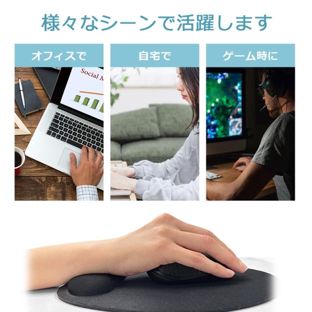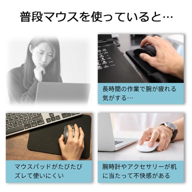 「長時間のマウス操作・PC作業でなんとなく腕がつかれる気がする…」「腕時計やアクセサリーをしたいけど、机にあたって不快感がある…」「マウスパッドがずれて使いにくい」
