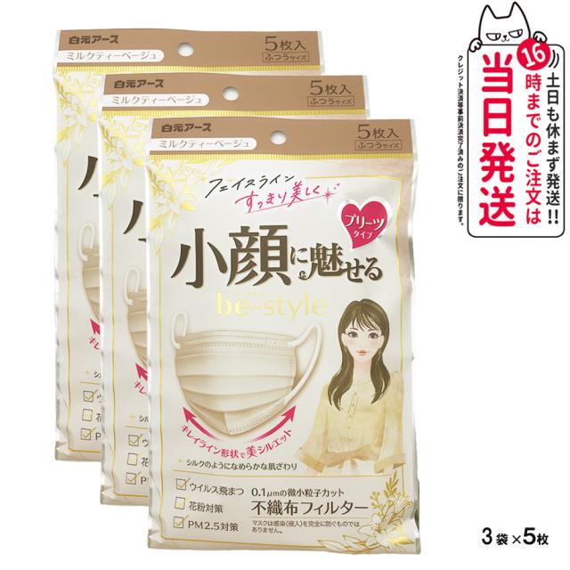 【3袋セット】白元アース マスク ビースタイル プリーツタイプ ふつうサイズ ミルクティーベージュ 5枚入×3 小顔に魅せる 耳らく 普通 送料無料