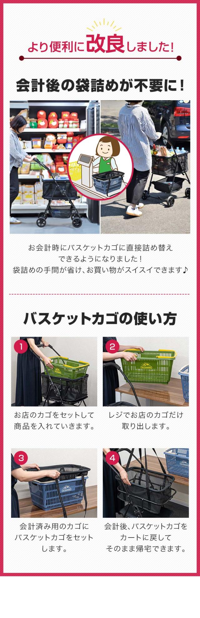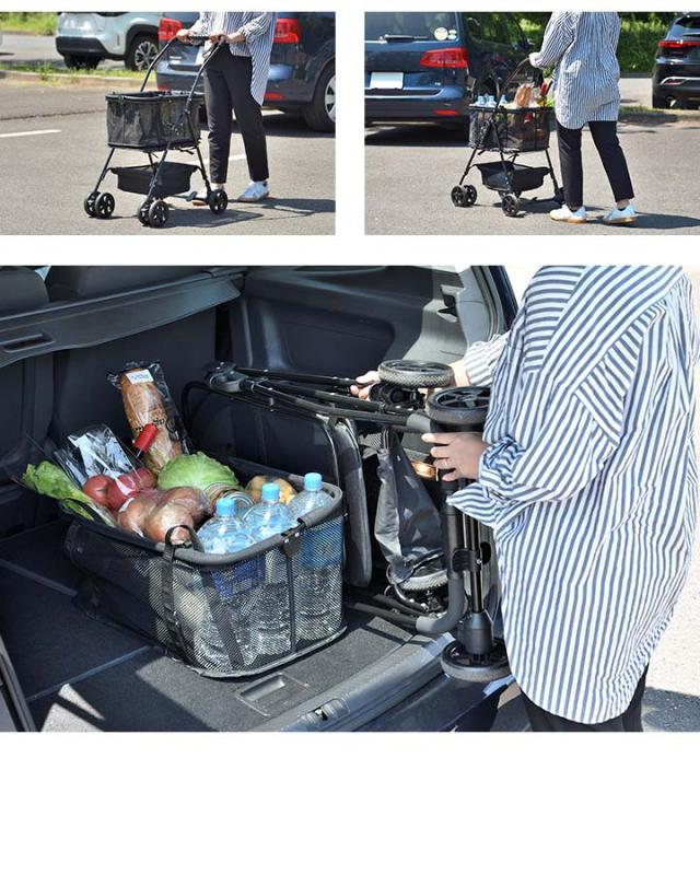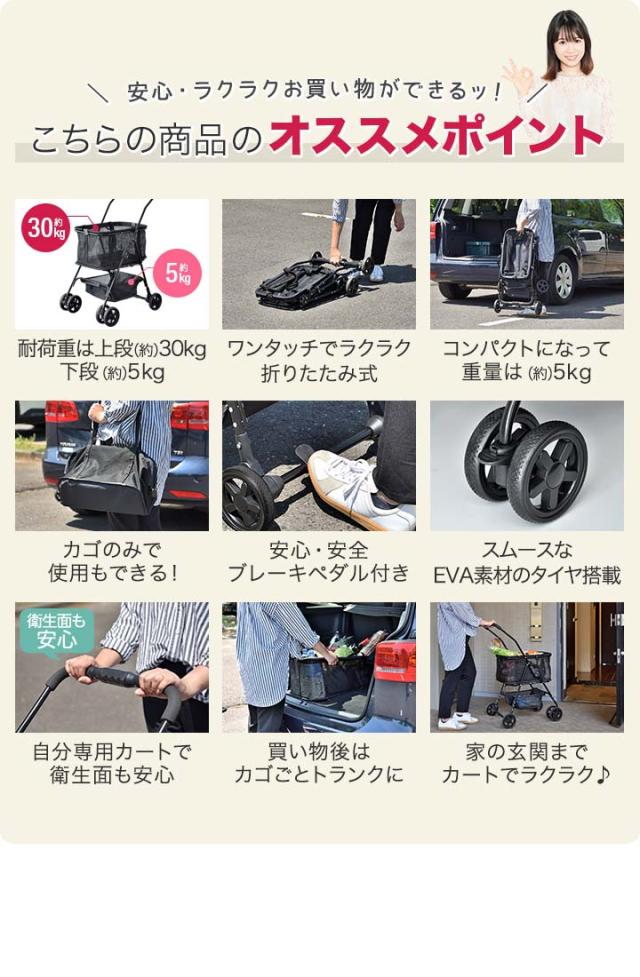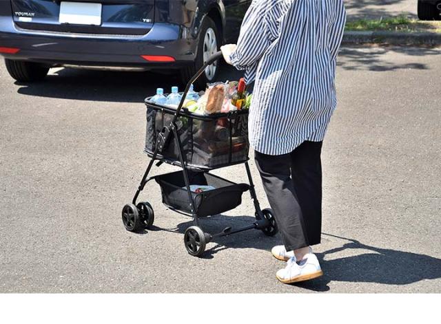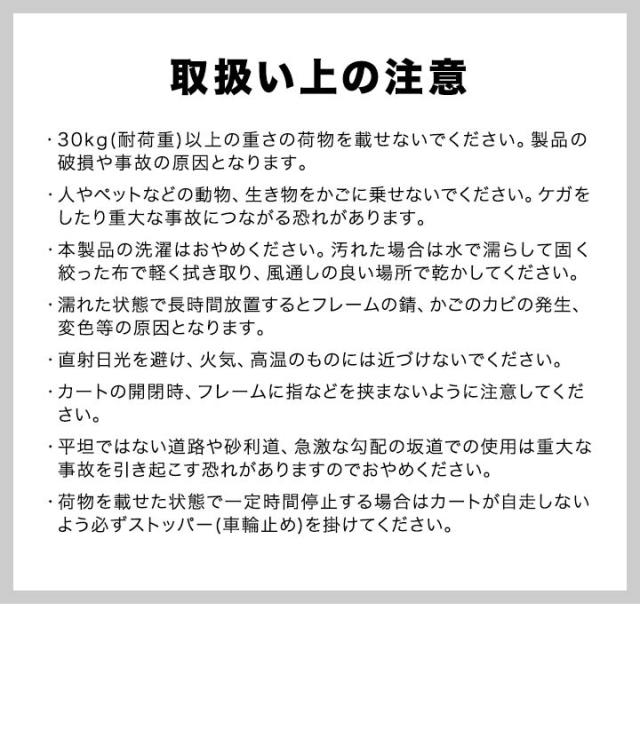 - カゴの耐荷重約3Okgが決め手で、配送も早く、梱包もしっかりしており使い出すまでの組み立ては車輪の取付だけで、軽量で、スムーズに滑走し、ブレーキも効いて、難なく折り畳み&広げたり出来てるので気に入りました。