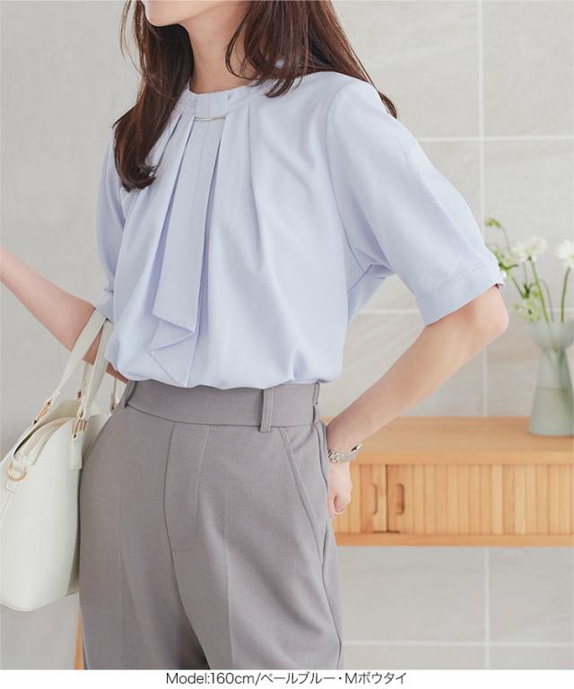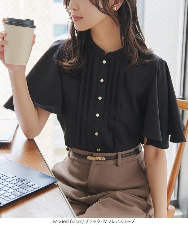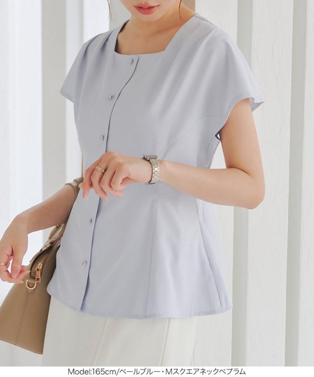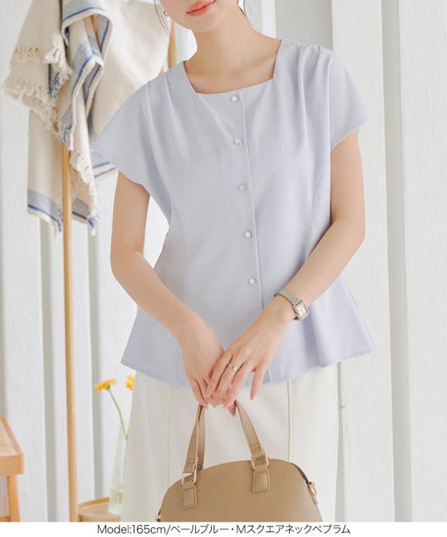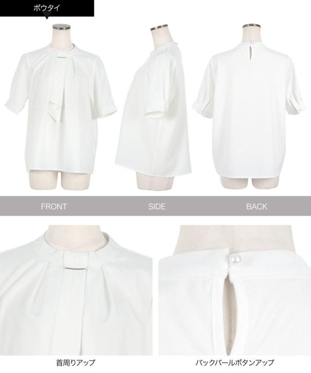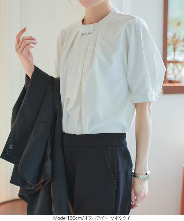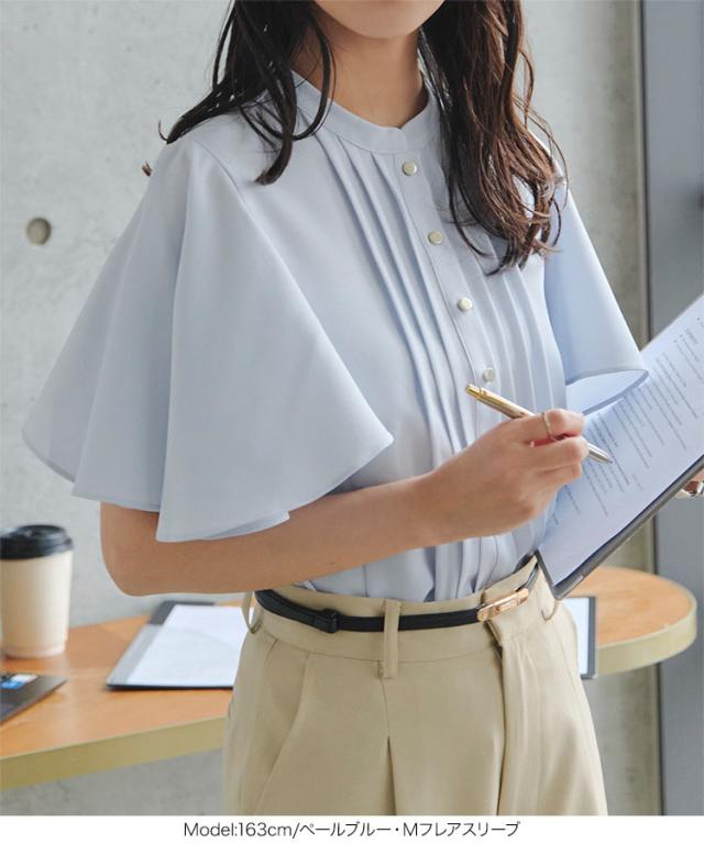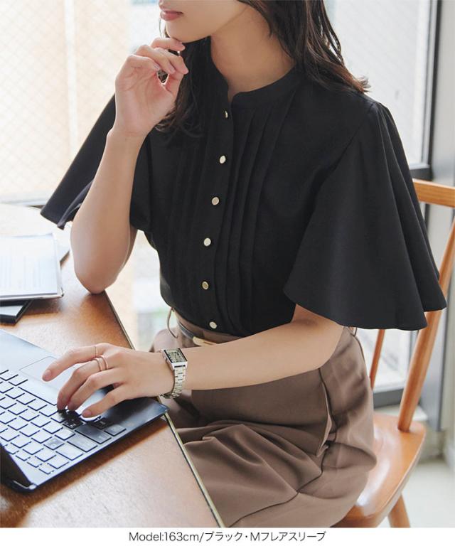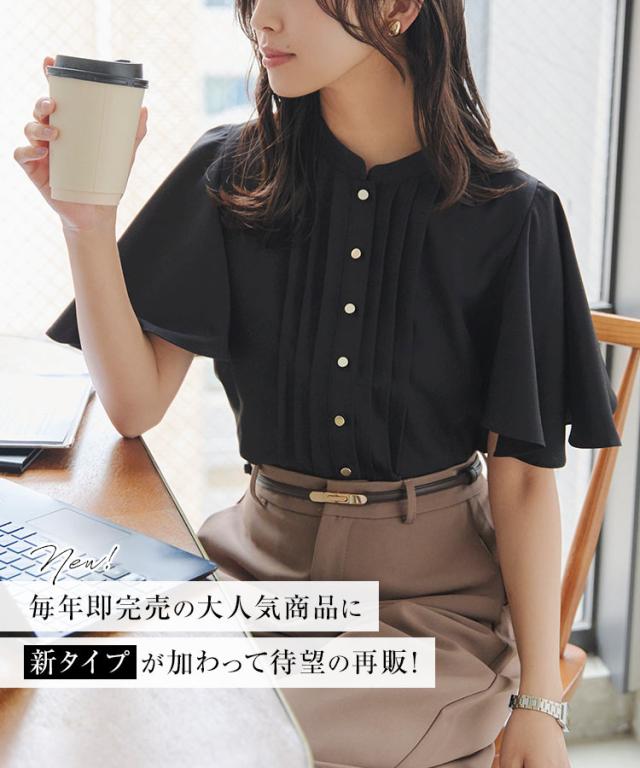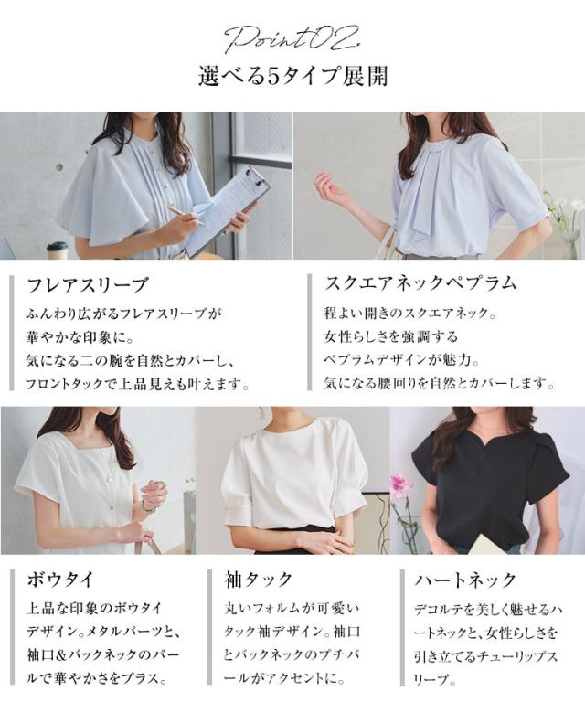 春新作 選べる5タイプ 半袖デザインブラウス C6759 入荷済 レディース シャツ オフィス 釦 ゴールド パール きれいめ エレガント Vネック スクエアネック スタンドネック スタンド スタンドカラー ギャザー タック ペプラム 夏 スーツ