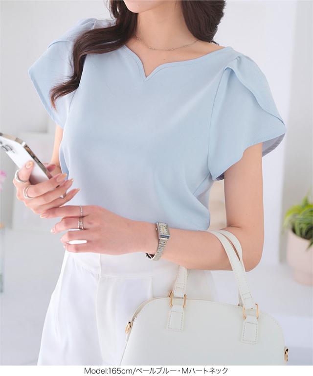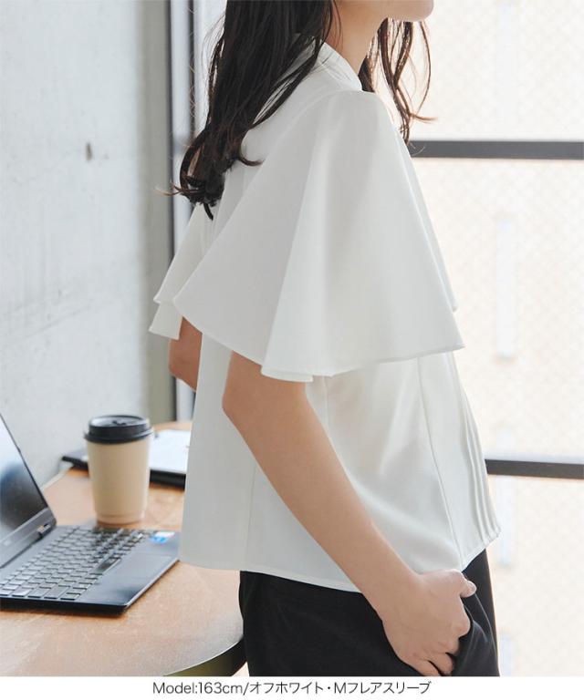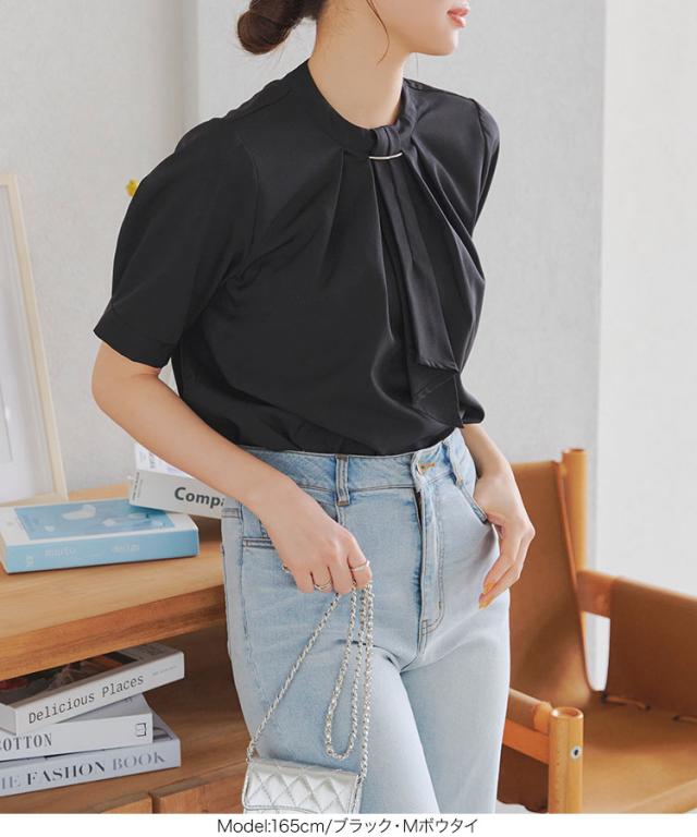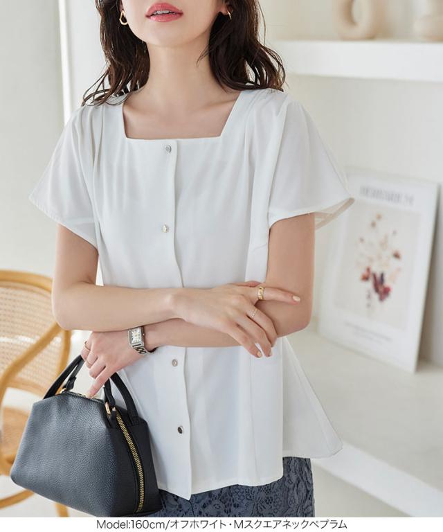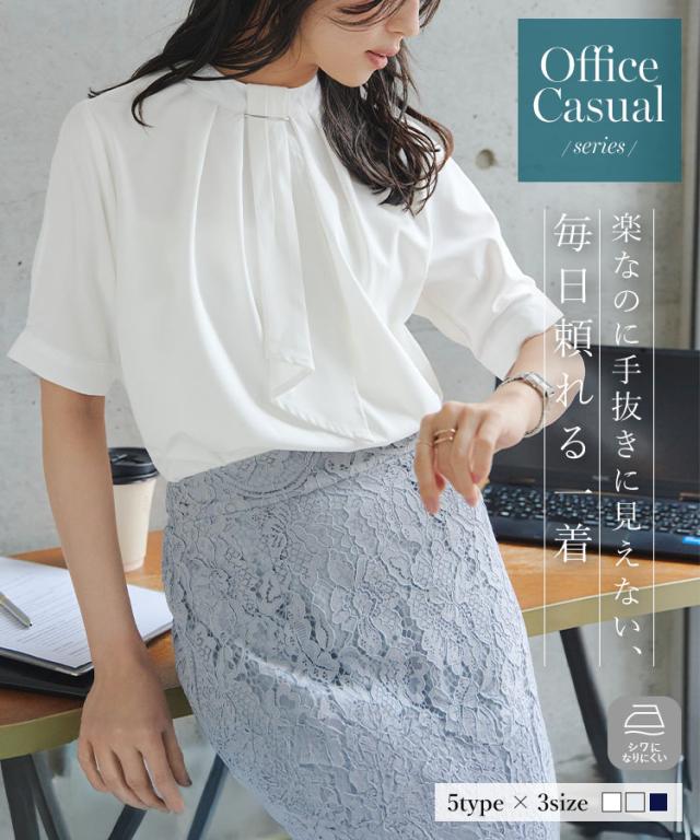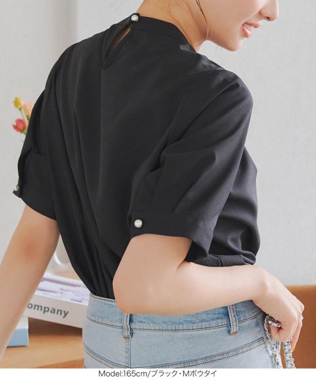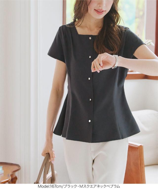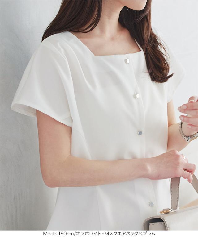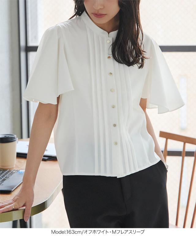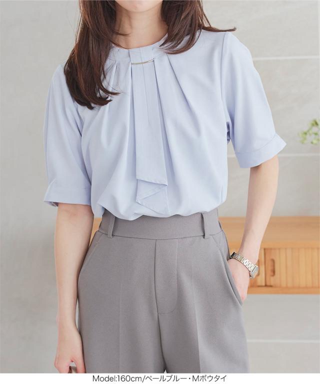 春新作 選べる5タイプ 半袖デザインブラウス C6759 入荷済 レディース シャツ オフィス 釦 ゴールド パール きれいめ エレガント Vネック スクエアネック スタンドネック スタンド スタンドカラー ギャザー タック ペプラム 夏 スーツ