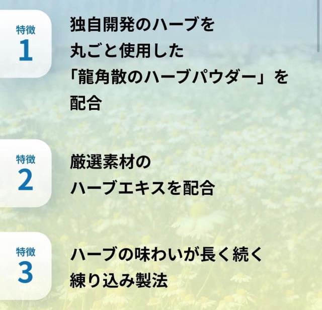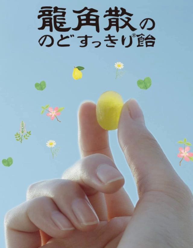 カリン・カミツレ主成分とした龍角散のハーブパウダーと19種類のハーブエキスを飴に直接練り込んでいるので、舐めはじめから舐め終わりまで味と香りが長く続くのど飴です。