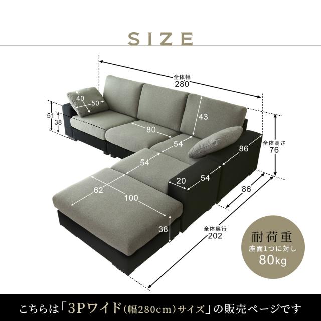 【3Pソファ】:幅280×奥行86×高さ76×座面高38(cm)