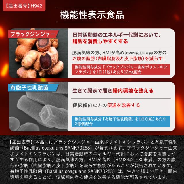 ブラックジンジャー抽出物(ブラックジンジャーエキス、デキストリン)(国内製造)、有胞子性乳酸菌(乳糖、有胞子性乳酸菌)、マルチトール、唐辛子、イヌリン、デキストリン、難消化性デキストリン、フラクトオリゴ糖、α-リポ酸、ヒハツ抽出物、ギムネマエキス末、コエンザイムQ10、植物油脂(ビタミンE含有)/ゼラチン、シクロデキストリン、セルロース、ステアリン酸Ca、微粒二酸化ケイ素、V.C、ナイアシン、パントテン酸Ca、V.B6、V.B2、葉酸、V.A、V.D、V.B12(一部に乳成分、ゼラチンを含む)
