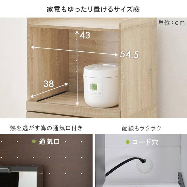 引出しやスライド棚付きでキッチン家電も使いやすい。
