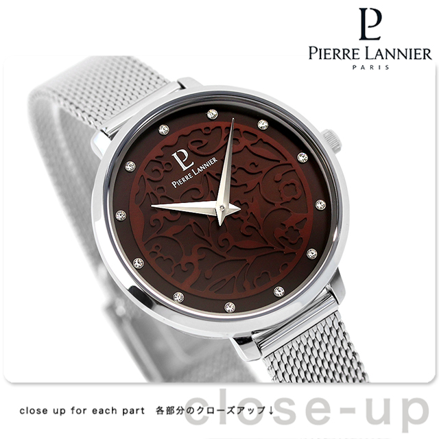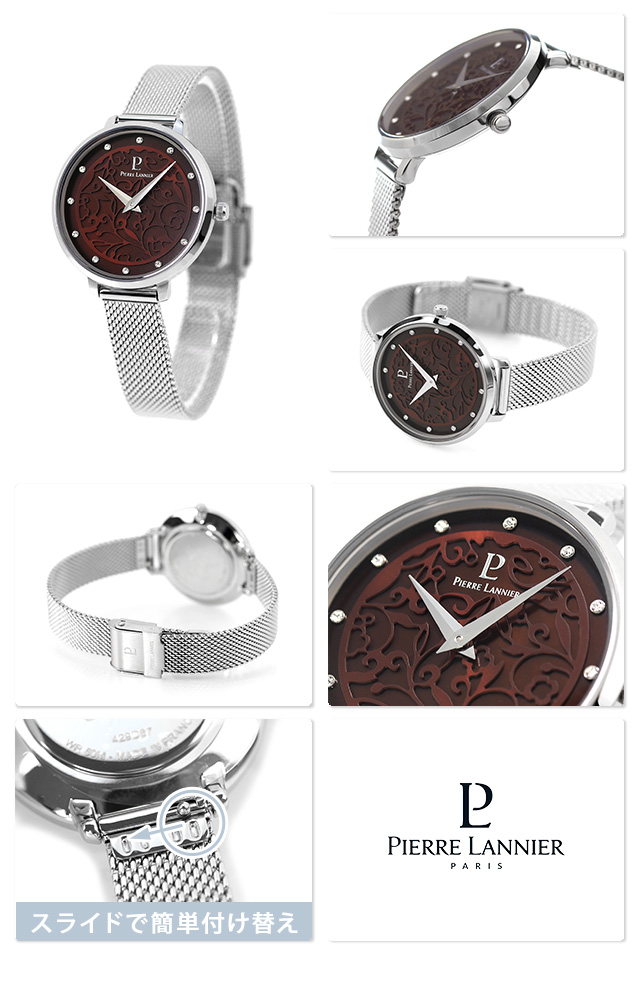 正規品 ピエールラニエ エオリア コレクション ショコラ フランス製 クオーツ レディース 腕時計 P429D674 Pierre Lannier eolia アナログ ブラウンシェル ◆ピエール・ラニエ社は、1977年にフランス、ストラスブルグ市近郊に創設されました。「常に時代の最先端を駆けるファッション性の高い時計作り」をコンセプトに、多くのファンを魅了しています。 レースのようなカッティングが目を惹く文字盤の「エオリア」。角度によってオーロラに輝くシェル文字盤は日本限定モデルです。インデックスにはさり気なく石をあしらいジュエリーのような煌き。何気ない日常に華を添える時計に仕上がっています。また、ベルト裏面のつまみのついたバネ棒をスライドさせるだけの操作でバンドの取り外し、取り付けが簡単に行えます。気分や服装にあわせてお手持ちのベルトと付け替え、お楽しみいただけます。手元を華やかに彩るデザインで、プレゼントにもおすすめです。
