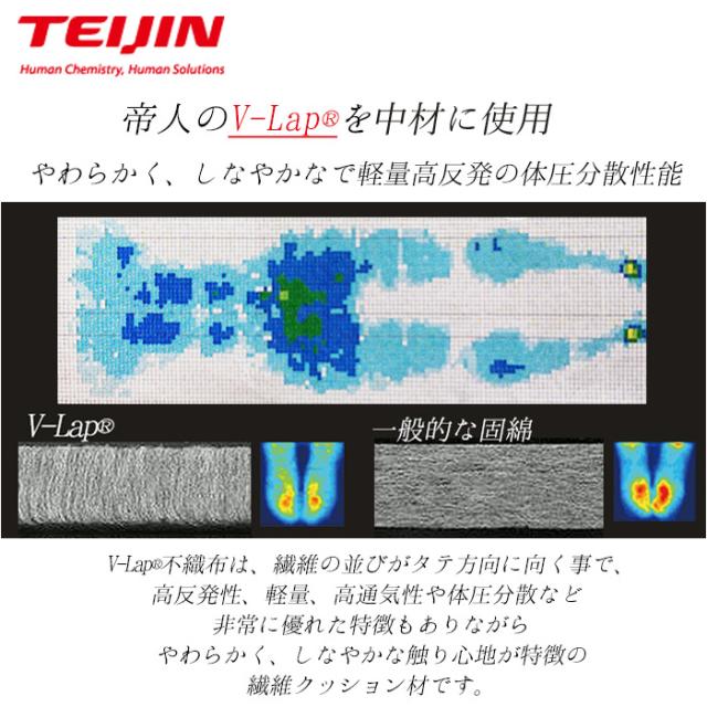 中材には、薄くて軽いのに高反発で耐久性や通気性にも優れたへたりにくい強い 超軽量素材[V-LapR]を使用しています。