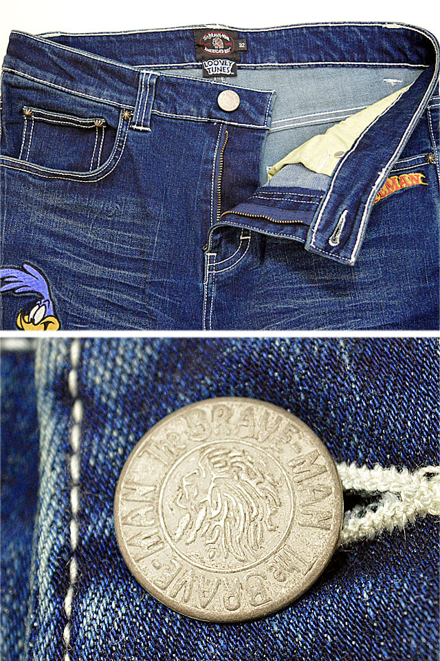 1920年代〜40年代にアメリカでワークウェアを中心とした製品を世に送り出したブランド「The BRAVE-MAN」から「BR×LOONEYコラボ ストレッチバイカーパンツ (LTB-2304)」のご紹介です。 アメリカのワーナーブラザーズが製作するアニメーション【LOONEY TUNES】の人気キャラクターをモチーフにしました! 今回は、輝ける発明家!?「ワイリー・コヨーテ」と、アメリカの野鳥オオミチバシリをモデルとしたキャラクター「ロードランナー」をアートモチーフとしました。 バック左ポケットにコヨーテ、フロントからサイド、バックにかけて右腿にロードランナーをそれぞれ刺繍で落とし込みました。 追いかけっこをしているような、躍動感のあるデザインが魅力的です。 フロント左ポケット縁にはブランドロゴを刺繍。 バック右ポケットにはウイングをこちらも刺繍で表現しました。 トップボタンにはブランドオリジナルのものを採用。 | ||||||||||||||||||||||||||||||