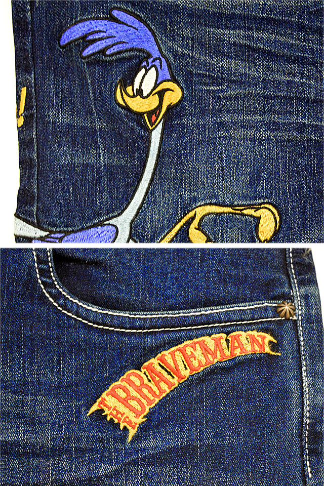 バック左ポケットにコヨーテ、フロントからサイド、バックにかけて右腿にロードランナーをそれぞれ刺繍で落とし込みました。