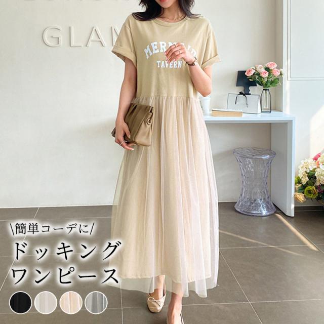 春新作 ワンピース ドッキング 半袖 レディース 春夏 おしゃれ ゆったり ロングワンピース マキシワンピース 薄手 透け感 黒 白 Tシャツ ロゴ クルーネック チュールスカート 異素材 ミックスマッチ プルオーバー 伸縮性 ストレッチ ルームウェア