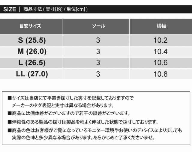 | 素材 | 本体/合成皮革 ソール/合成底 ※製造工程の過程による、小さなほつれ、微小な縫製のずれ、 多少の接着剤のはみだしなどの 返品対応は致しかねます。ご了承ください。 | ||