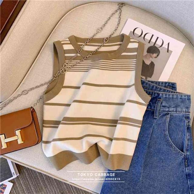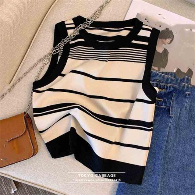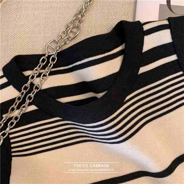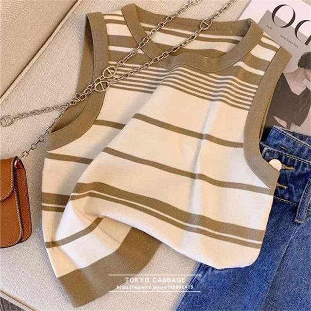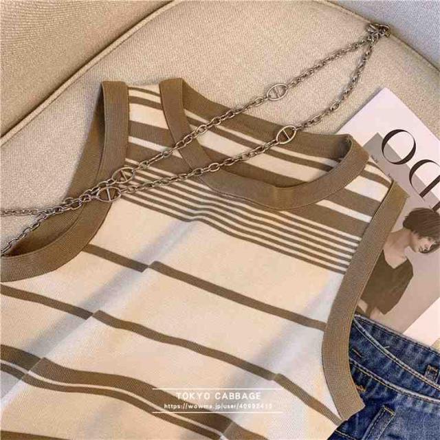 2TYPEニットタンクトップ レディース トップス タンクトップ ラウンドネック ノースリーブ クロップド ショート丈 ボーダー スリム リブヘム タイト ナイロン 無地 ガーリー デイリー 春 夏 カジュアル zf-230522-01