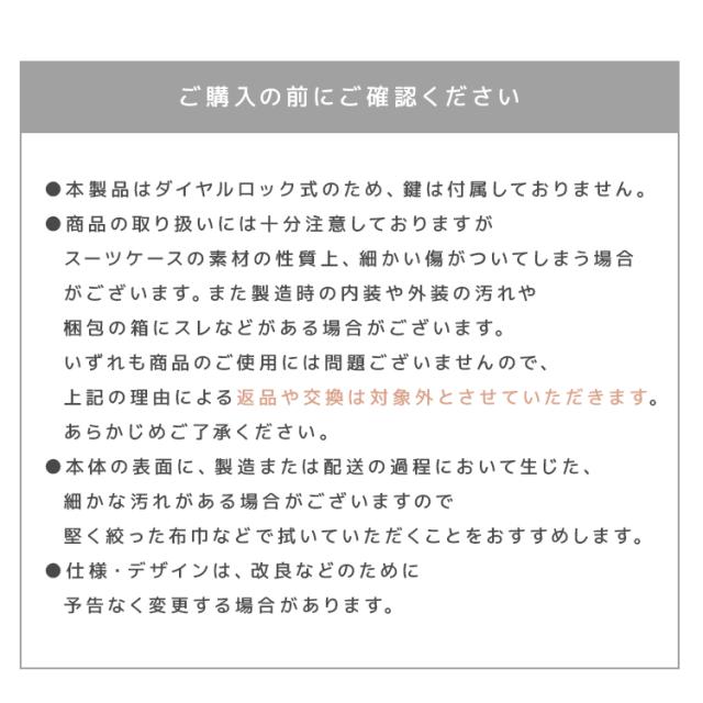 | 注意事項 | ・本製品はダイヤルロック式のため、鍵は付属しておりません。 ・商品は、モニターによって色合いが異なって見える場合があります。 ・スーツケースの素材の性質上、細かい傷がついてしまう場合があります。また製造時の内装や外装の汚れや梱包の箱にスレなどがある場合があります。ご使用には問題ありませんので返品・交換は対象外とさせていただきます。 ・製造または配送の過程において生じた、細かな汚れがある場合がございますので布巾などで拭いてご使用ください。 ・仕様・デザインは改良のため予告なく変更することがあります。 |