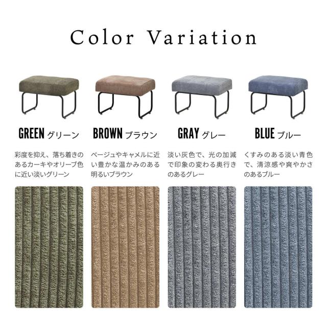 ブラウン、グリーン、ブルー、グレーの4色展開でご用意しております。少しくすみのかかった落ち着きのあるカラーリングで、どんなインテリアにも馴染みます。使用しているコーデュロイ生地は綿やポリエステル、ナイロンなどの素材を使って織り上げられた生地の一種です。その特徴は、縦にリブのような溝が入っていることです。この溝が生地に深みを与え、柔らかい手触りで暖かく深みのある肌触りになります。