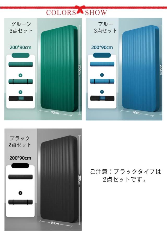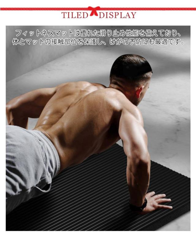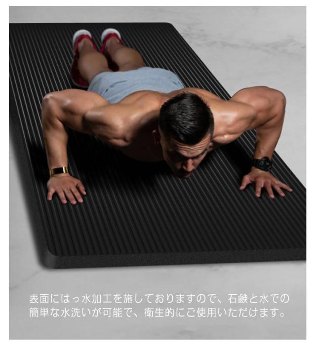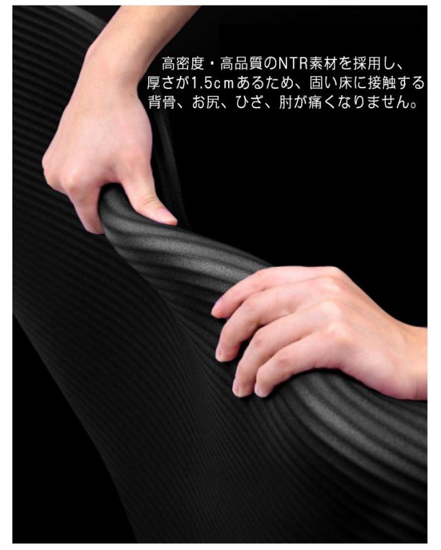 | 長さ200cm×幅90cm×15mmの大きいサイズですので、体型や身長にかかわらず快適にご使用いただけます。 高密度・高品質のNTR素材を採用し、厚さが1.5cmあるため、固い床に接触する背骨、お尻、ひざ、肘が痛くなりません。 フィットネスマットは優れた滑り止め性能を備えており、体とマットの接触部位を保護し、けがの予防にも最適です。 バランスを保ちやすい弾性で、さまざまなトレーニングにご使用いただけます。 表面にはっ水加工を施しておりますので、石鹸と水での簡単な水洗いが可能で、衛生的にご使用いただけます。 | |