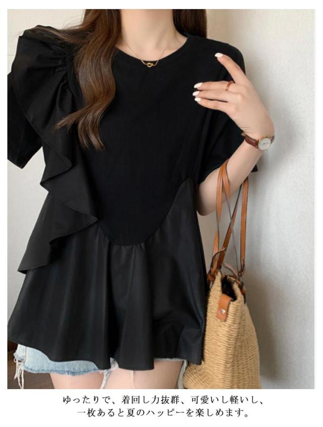 半袖Tシャツ レディース ブラウス 春夏 トップス フリル クルーネック 送料無料 フレアスリーブ 切替 シャツブラウス プルオーバー 無地 可愛い シンプル カジュアル