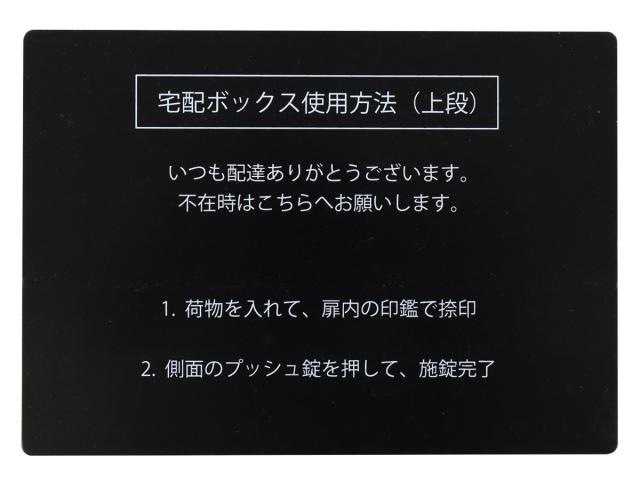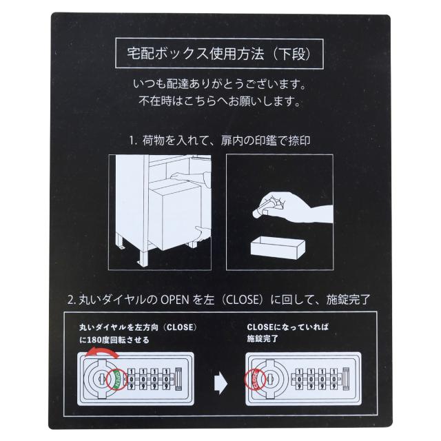 下段は、ダイヤルロックとシリンダー錠(ダイヤル解錠番号が分からなくなった際の緊急用)でドアの開閉が可能です。ダイヤルロックは、鍵を施錠した際、鍵を解錠した際にダイヤル番号が「0000」にリセットされ、設定したダイヤル番号の漏洩の心配がありません。マグネット式でお好きな場所に貼付け可能な、宅配業者用の配達マニュアルもついています。