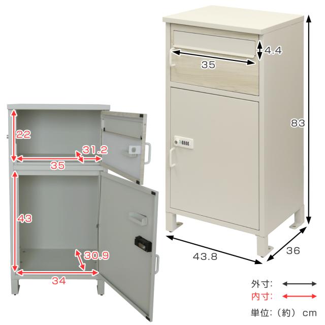 | サイズ | 約 幅43.8×奥行36×高さ83(cm) 上段 投函口:約 幅35×高さ4.4(cm) 取出口:約 幅35×奥行31.2×高さ22(cm) 下段 取出口:約 幅34×奥行30.9×高さ43(cm) |