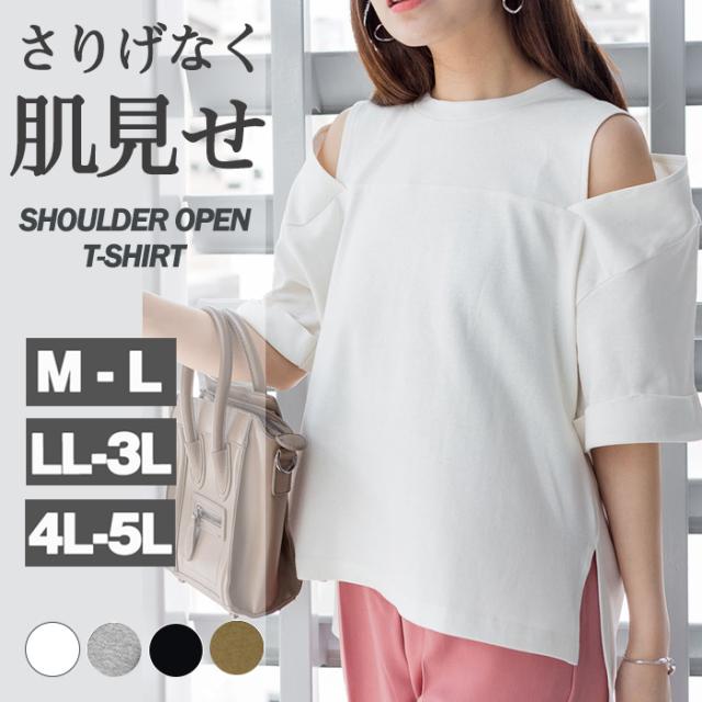 メール便送料無料 半袖 ショルダーオープン半袖Tシャツ 肩だし コットン 綿 トップス 4カラー M〜5L 0401