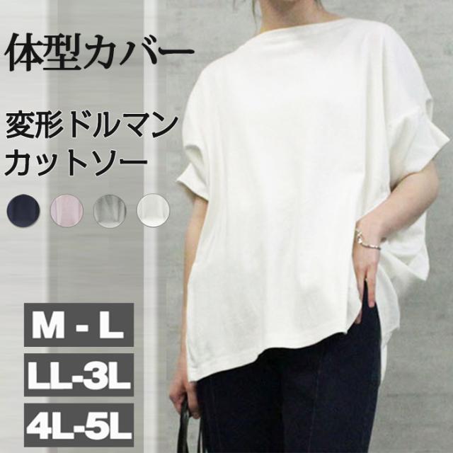 メール便送料無料 個性派シルエット 変形ドルマンカットソー ボートネック コットン 綿 トップス 半袖 4カラー M〜5L 0164