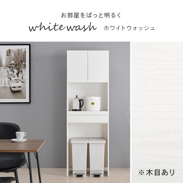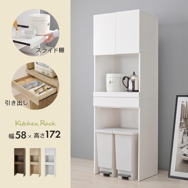 キッチンにゴミ箱スペース キッチンラック 幅58 ハイタイプ 扉付き 【送料無料】 ゴミ箱上ラック キッチン収納棚 食器棚 炊飯器 スライド 木製 ナチュラル ホワイト 白