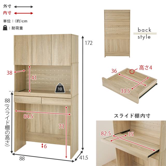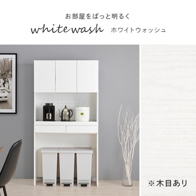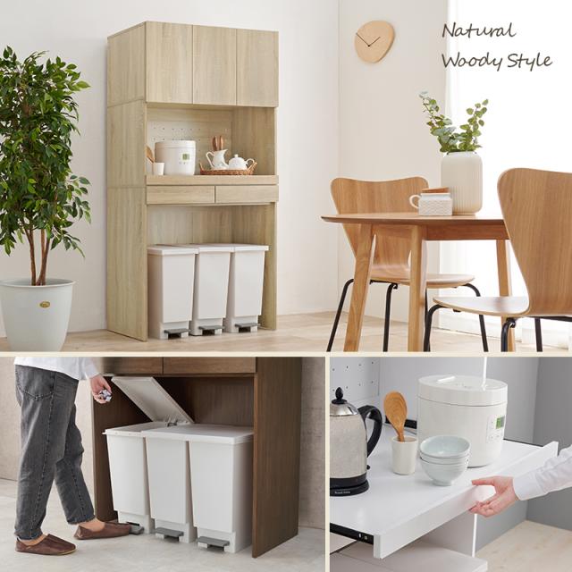 キッチンにゴミ箱スペース キッチンラック 幅88 ハイタイプ 扉付き 【送料無料】 ゴミ箱上ラック キッチン収納棚 食器棚 炊飯器 スライド 木製 ナチュラル ホワイト 白