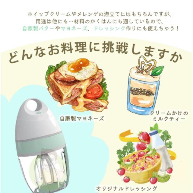 泡立て器で、ミキサー、泡立て 混ぜることがこれ一台で調理できます。柔らかめの食材卵、液体などの食材対応でき、玉ねぎのみじん切り・スムージー・離乳食など普段に時間がかかる料理が簡単・手軽に作れます。また、キレイな包装で引越し、結婚式、お誕生日、記念日、お祝い等の大切な場合に家族や友達に喜ばれるプレゼントです!