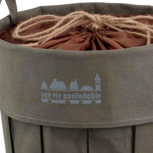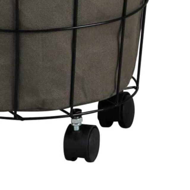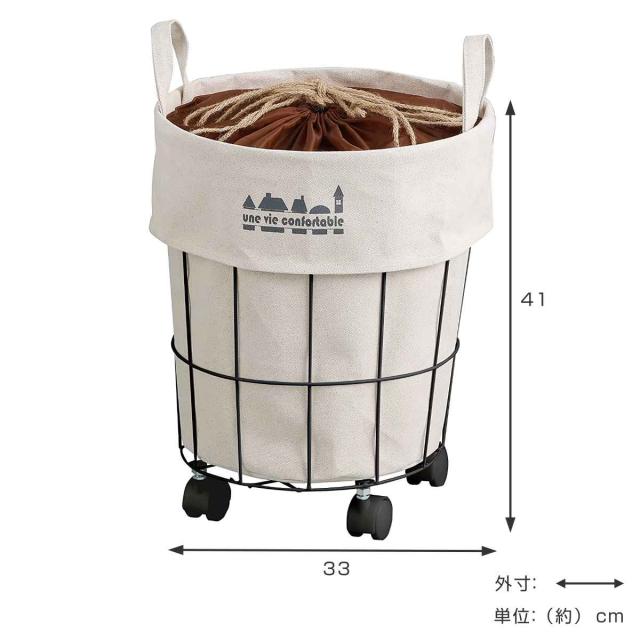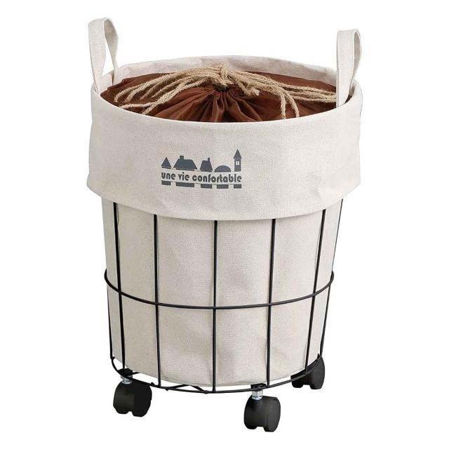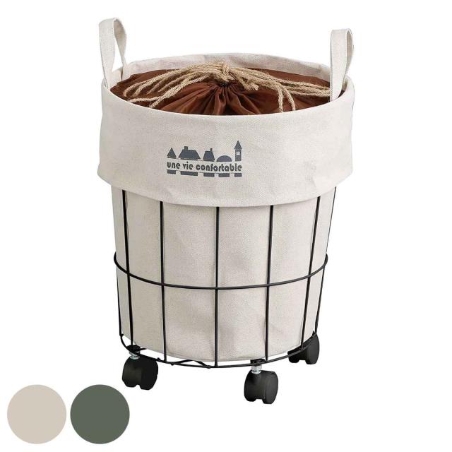 ワイヤーフレームにキャンバス生地がセットされた車輪付きラウンドカートです。ランドリーバスケットとしてやおもちゃ収納などに最適で、上部には巾着が付いているので、見えてほしくない洗濯物などもサッと中身を隠せます。落ち着いた色味とシンプルなデザインで、どんなお部屋にも馴染みやすいです。