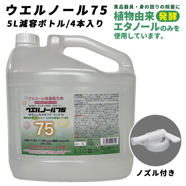 ウエルシー製薬 アルコール除菌衛生剤 ウエルノール65 5L 減容ボトル 4本入り ノズル付き 除菌 消臭剤 食品添加物エタノール製剤 業務用 日本製 ステイホーム 自宅待機 ウェルノール 配送先個人宅指定不可