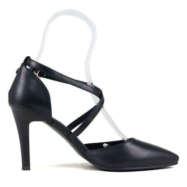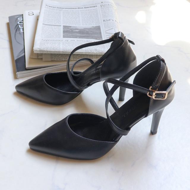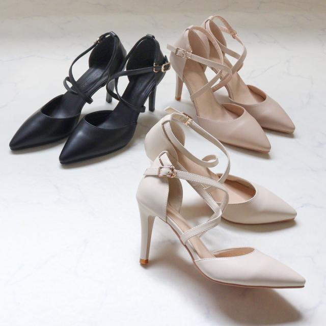 ポインテッドトゥと細いクロスストラップが、女性らしい華奢な足元を演出します。