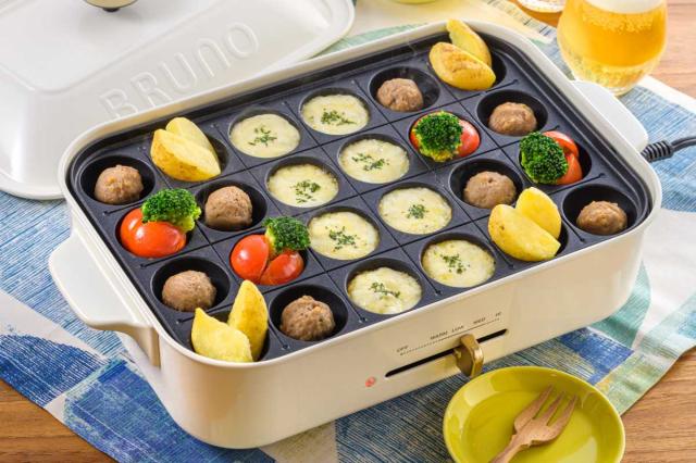 平面プレートとたこ焼きプレートの2種類のプレートがセットになっています。料理のアイディアが広がる2枚のプレートは、「焼く」はもちろん、フタを使って「蒸す」もおしゃれにこなします。プレートを使い分けて、前菜からデザートまで幅広い料理の出来立てをその場でシェアして楽しめます。