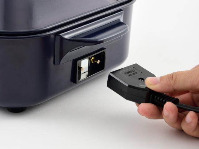 コンセントはマグネット式なので、調理中に万が一引っかかっても簡単にコードが外れて安心です。また、自動で設定温度を維持するサーモスタットが付いており、温度の上がり過ぎを防ぎます。