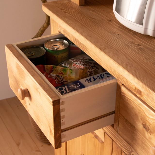 カトラリーやキッチン雑貨の収納に便利な3杯の引出しは、頑丈な箱組仕様です。取っ手がついている前板が面でつけられているので、強度があり壊れにくくなっています。