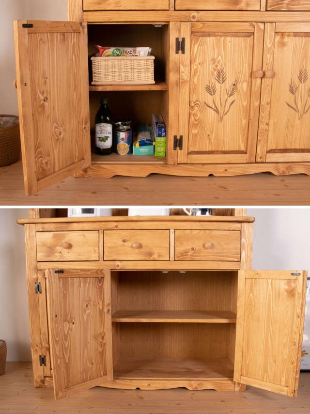 自然に囲まれているような、素朴さとぬくもり感のあるカントリースタイルのカップボードです。天然木無垢材を使用しているので、使い込むほどに味わい深くなり、温かみのある空間を演出します。