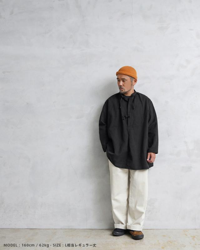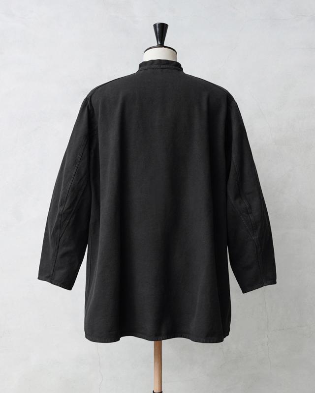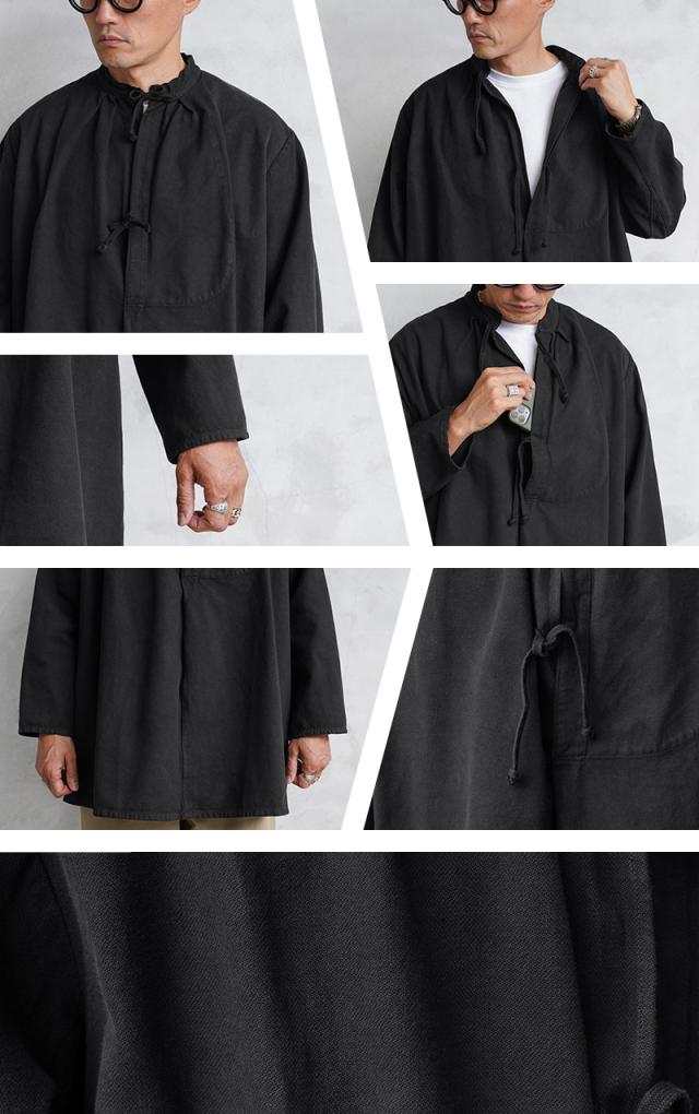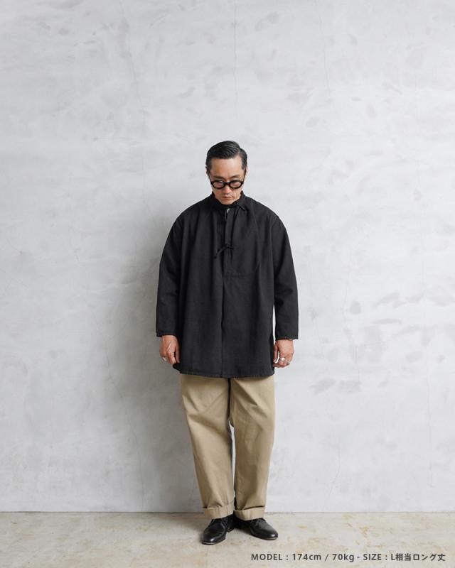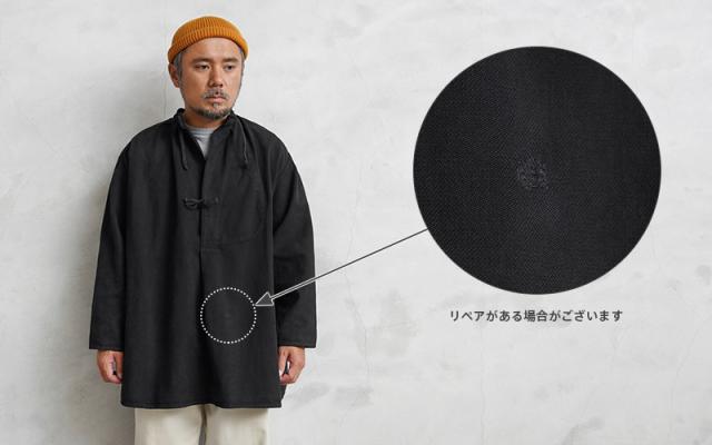 | 商品説明 | 実物 USED スイス軍 40’s ヴィンテージ マウンテン スモック BLACK染めのご紹介です。 スイス軍で1940年代を中心に使用されていたマウンテンスモックが入荷しました! ブラックカラーにオーバーダイ(後染め)がされていますが、放出された後にヨーロッパ本国で製品染めが施され、数十年の時を経て当店へ入荷したアイテムです。 ジャーマンクロスのような変則的な繻子織りのコットン素材が使用されており、わずかに微起毛した表面が肌触りと風合いの良い質感です。近年ではMAISON MARGIELAが、このスモックをサンプリングしたアイテムをメンズのコレクションラインで発表したことで、このアイテムの認知度がさらに高まりました。 ネックラインはスタンドカラーに紐で結ぶタイフロントデザインが取り入れられたクラシカルなディテールで、フレンチワーク系のヴィンテージスモックやフィッシャーマンスモックを連想させる雰囲気を感じさせます。 フロント紐の左側には手のひらがすっぽりと収まるサイズ感のポケットが備わっていますので、貴重品やスマホなど重要な荷物を安全に収納することが可能です。 後ろ身頃にオフセットされた肩のラインや、袖下に設けられたマチなど既製品では見かけることの少ない珍しいデザインが施されている点もこのアイテムの魅力で、プルオーバータイプなので着脱しやすいように仕立てられた身幅広めのゆったりとリラックスして着れるというのもポイントです。 しっかりとした肉厚なコットンの質感が最高で、雰囲気の良さも別格と言えます。ワードローブに加えていただけばそれだけでも所有欲を満たしてくれる、ヴィンテージ好きにはたまらないミリタリースモックです。 | ||||||||||||||||||||||||||||||||||||||||