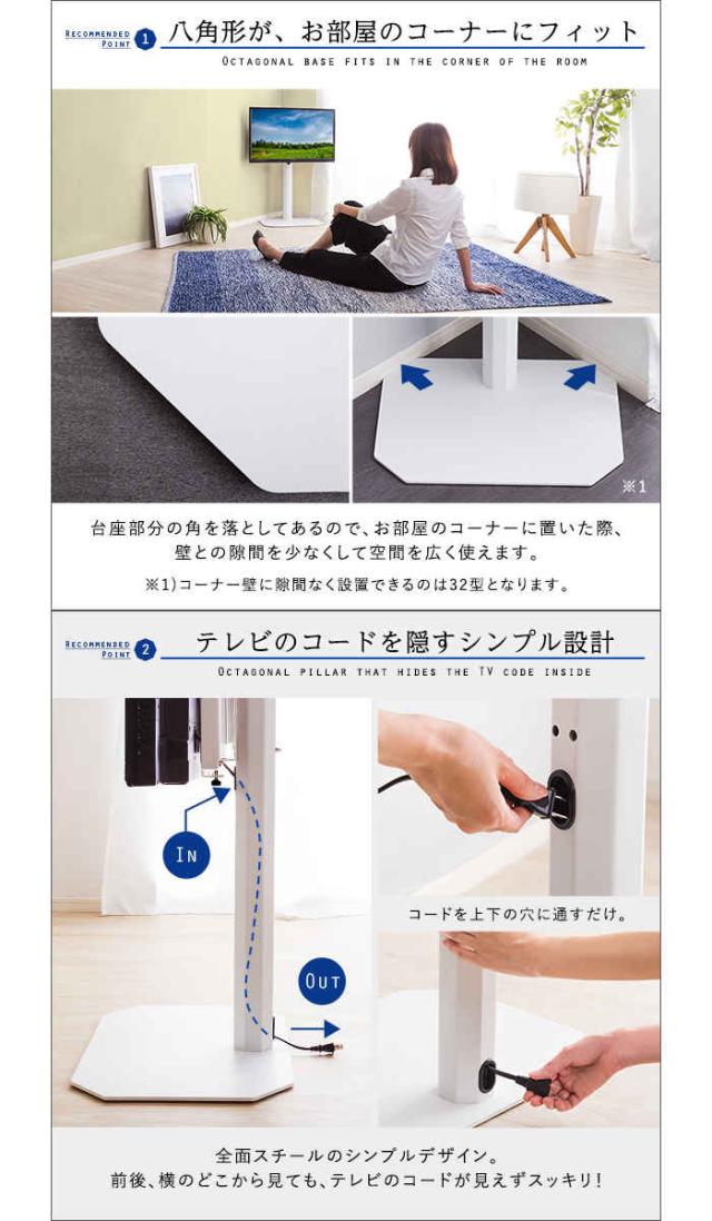 ブラック ホワイト ピンク グリーン 黒 白 緑 OCTA オクタ 八角 八角形 スチール スチール製 コード一体型 ワイドスイング 首振り 240° 240度 壁掛け風 壁寄せ テレビ台 TV台 テレビボード TVボード テレビスタンド TVスタンド AVボード 背面収納 コード収納 配線収納 インテリア すっきり スッキリ シンプル スタイリッシュ モダン シンプルインテリア シンプルモダン モダンインテリア 省スペース 高さ調節可能 工事不要 リビング 居間 寝室 部屋 室内 おしゃれ オシャレ お洒落 新築 新居 新生活 新社会人 就職 新学期 進学 入学 引越し 引っ越し 転居 転勤 単身赴任 一人暮らし ひとり暮らし 準備 必需品 必要なもの スポーツ観戦 映画鑑賞 おうちじかん おうち時間 快適