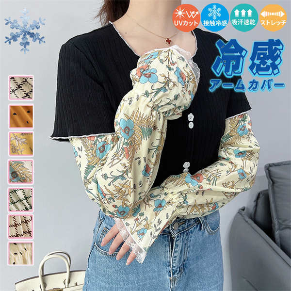ポイント超超祭 アームカバー 冷感 UVカット レース 花柄 吸汗速乾 袖カバー ひんやり クール 冷房対策 接触冷感 グローブ 通気性 涼しい おしゃれ 自転車