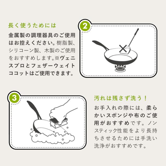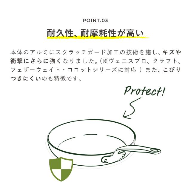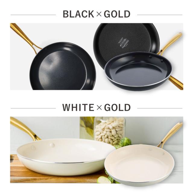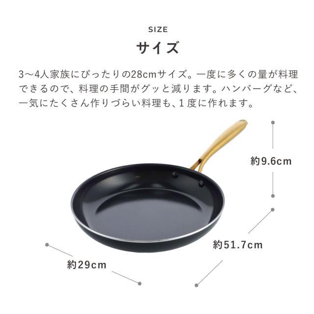 ノンスティック・セラミックコーティングが施され、熱伝導に優れたこびりつきにくいフライパンです。丸みのあるハンドルは中空になっているので軽く調理やお手入れをしやすい点も嬉しいポイントです。ブラックのボディとゴールドのハンドルの上品なデザインは調理後そのまま食卓にサービングするのもおすすめです。