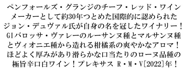 ペンフォールズ・グランジのチーフ・レッド・ワインメーカーとして約30年つとめた国際的に認められたジョン・デュヴァル氏が自身の名を冠したワイナリー!GIバロッサ・ヴァレーのルーサンヌ種とマルサンヌ種とヴィオニエ種から造れる柑橘系の爽やかなアロマ!ほどよく厚みがあり滑らかな口当たりのローヌ品種の 極旨辛口白ワイン!プレキサス R・M・V[2022]年!■さまざまなギフトアイテムをご用意しております。お中元 ギフト 御中元 お盆 お礼 敬老の日 クリスマス 冬ギフト お歳暮 御歳暮 お年賀 御年賀 お正月 年末年始 ご挨拶 バレンタイン ホワイトデー お返し 父の日 母の日 ギフト 贈答品 お土産 手土産 御祝 御礼 内祝い 引き出物 お祝い 結婚祝い 結婚内祝い 出産祝い 出産内祝い 引き菓子 快気祝い 快気内祝い 進学祝い 誕生日祝い バースデーケーキ プレゼント Wedding ウェディング ホームパーティ お花見 パーティ 退職ギフト 退職 就任祝い1400004001116