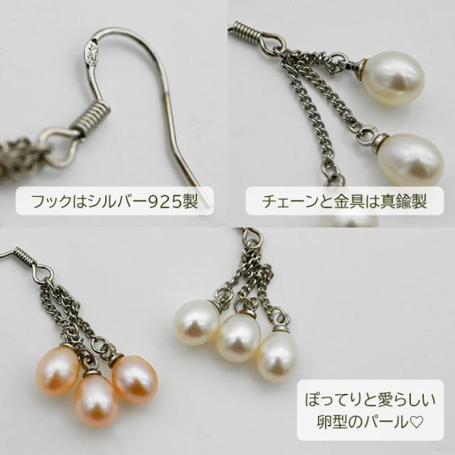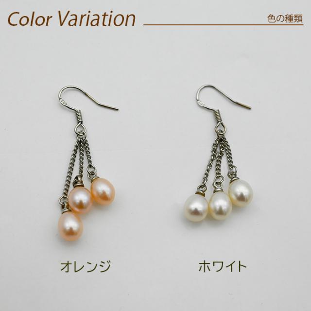 パールピアス 3連 シルバー925 フックピアス 淡水パール ホワイト オレンジ 片耳 1個 耳たぶ シンプル
