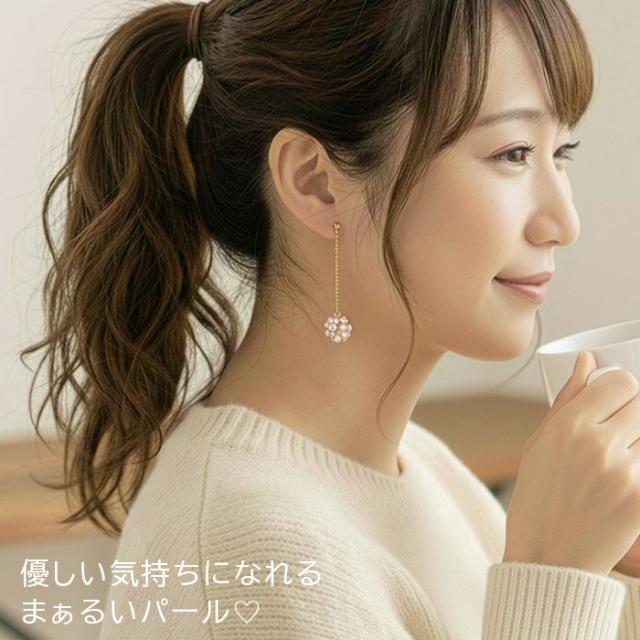 | まるでブーケのような丸くてかわいいパールボール。 やさしい気持ちになれるパステルカラーで派手過ぎずキュートな印象♥ 長めのチェーンでゆらゆら揺れて、髪をまとめたりアップにしたり耳を出す機会が多くなるこれからの季節にぴったり! 嬉しい金属アレルギー対応ステンレス製だから、毎日気軽に使えて、コーディネートのワンポイントアクセントに♪ |