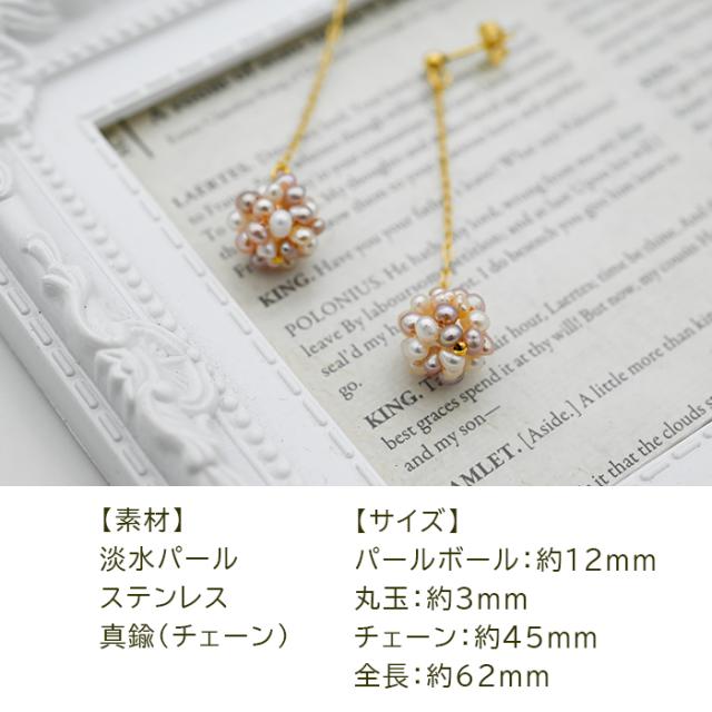 淡水パール ピアス パールボール ステンレス 丸玉 チェーン パステルカラー 片耳 1個 耳たぶ 揺れる