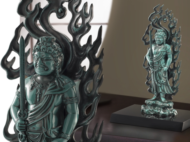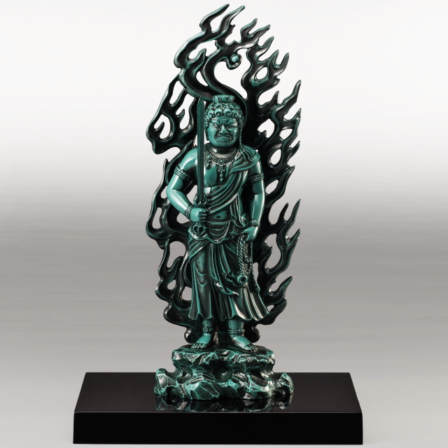 仏師・牧田秀雲 原型作!伝統工芸高岡銅器の技で作られた仏像作品。不動明王に託した敬虔な祈りが敢然たる力強さの中に息づいています。憤怒の相が示す救いの意志!どんな者をも救済へと導く不動明王。お不動様と親しまれ、大日如来の化身として、五大明王の中心に位置する不動明王。どんな者をも真理に導き救済するため、畏怖の念を与える恐ろしい憤怒の形相を浮かべ、右に宝剣、左に羂索を持ち、火炎光背を備えるお姿を秀雲作の原型をもとに再現しました。■高岡銅器■400年以上もの歴史を誇り、多彩な技術を駆使し、銅器以外にも様々な金属加工を有し、日本のみならず世界的にも有名な伝統工芸です。