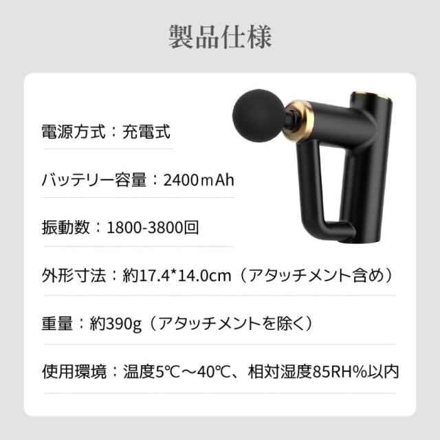「セット内容」マッサージガン本体、充電ケーブル、4つマッサージヘッド