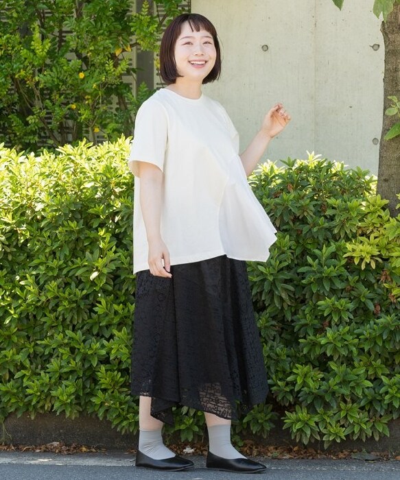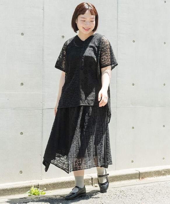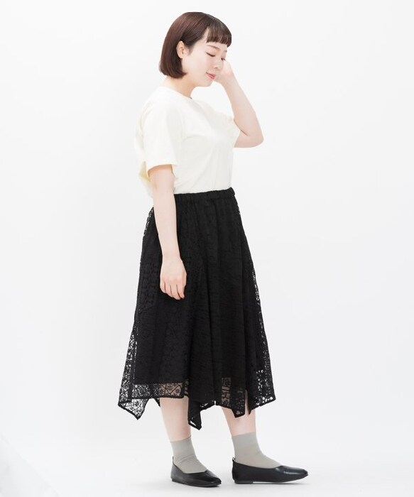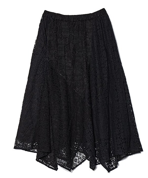 ◆ 流れにまかせたいレーススカート (大きいサイズ) ◆4種類のレースを使用したスカートです。フラワー模様が華やかな雰囲気を感じさせ、どんなトップスでも効果抜群。さらに 接ぎ目ごとに異なる展開を入れることで特徴的なシルエットに仕上げました。透け感のある生地なので附属のペチだけでなく お手持ちのボトムと合わせるのも◎丈感といい シルエットといい こなれ感たっぷりに穿きこなせる一枚です。Olaca model:H164 B94 W82 H103 *3サイズ着用《お取り扱いについて》・着用またはお取り扱いの際は、アテンションタグや洗濯ネームを必ずご確認ください。《注意事項》※商品の色や質感をできるだけ忠実に再現するよう心がけていますが、撮影場所やお使いのモニター環境により、実物と若干異なる場合がございます。予めご了承ください。※写真を許可無くコピー・転用することは固くお断りします。
