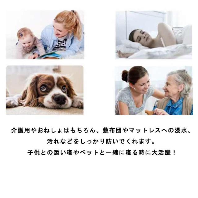 | ベイビーのおねしょ対策や老人の介護にもピッタリ!ボックスタイプの防水シーツ 表地は柔らかい素材を採用する。なめらかて優しい肌触り、お肌がデリケートな方にもおすすめ。 裏側のTPU膜を塗布して、防水仕様でマットレスに水分の浸透を防ぐ。 介護用やおねしょはもちろん、敷布団やマットレスへの浸水、汚れなどをしっかり防いでくれます。子供との添い寝やペットと一緒に寝る時に大活躍! 裏面は全周ゴム仕様になっているので、すっぽり被せるだけで着脱簡単、寝相を気にすることなく朝までぐっすり! | |