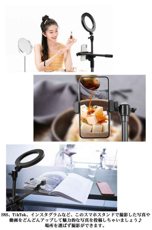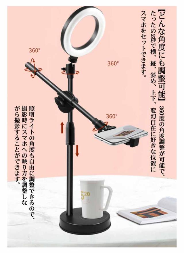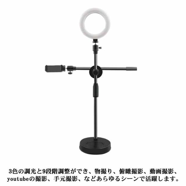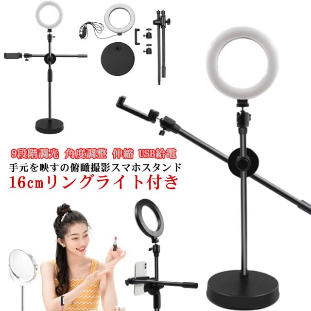 LEDリングライト 俯瞰撮影 スマホホルダー スマホスタンド 手元撮影 撮影照明用 卓上 撮影ライト 3色モード 9段階調光 角度調整 伸縮 USB給電 アート お料理 料理動画 お絵描 YouTube SNS TikTok 動画撮影 ライブ配信 オンラインレッスン オンライン会議 送料無料